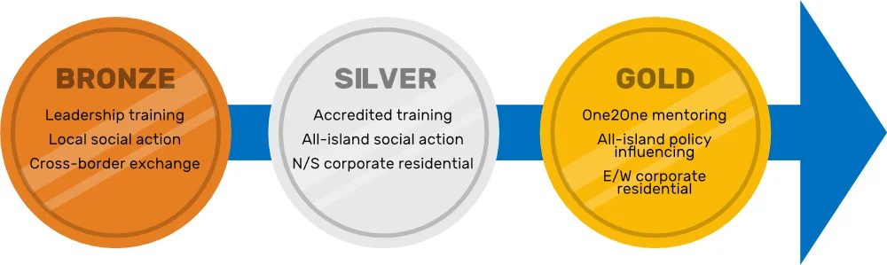 Following completion of Bronze, participants have the opportunity to progress to Silver and Gold levels through a competitive selection process. Successful applicants take part in an intensive all-island programme of activities delivered directly by Co-operation Ireland, with activities including leadership training, social action/lobbying for policy change, world of work experiences, and, at Gold level, one-to-one mentoring.